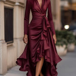Make an unforgettable entrance in this satin maxi dress, designed for formal evenings, winter weddings, and special celebrations. Crafted from luxurious satin, it drapes effortlessly along the body, offering a sleek, figure-flattering silhouette. The draped wrap design accentuates the waistline, while the flowing ruffle hem brings a soft, romantic finish — a balance of sophistication and modern allure.