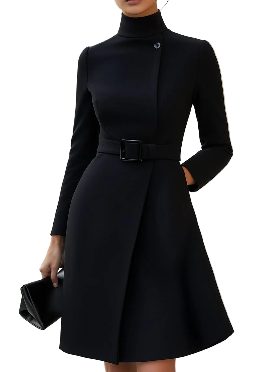 Women’s High-Neck Belted Midi Dress – Elegant Winter Style