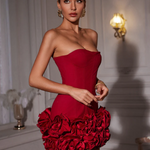 This red strapless mini dress features a fitted corset-style bodice with structured boning and a sculpted silhouette. The design is complemented by a voluminous ruffled satin skirt that adds texture and movement. The straight neckline and back zip fastening maintain a clean, supportive fit, while the smooth satin finish enhances the structured shape. Designed for evening wear and special occasions, this short corset dress combines a tailored upper body with a statement skirt for a bold, refined look.