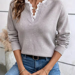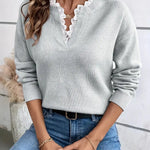 Women’s Lace Trim V-Neck Jumper – Elegant Ribbed Knit Sweater