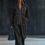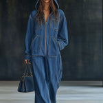 Women’s Loose Hooded Denim Jumpsuit – Long Sleeve & Zip Pocket