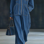 This versatile denim jumpsuit combines casual cool with retro-inspired charm, making it ideal for off-duty days, weekend outings, or a street-style look layered with a turtleneck or cropped jacket. The long sleeves and mid-weight fabric provide warmth and coverage, perfect for transitioning between seasons.