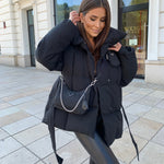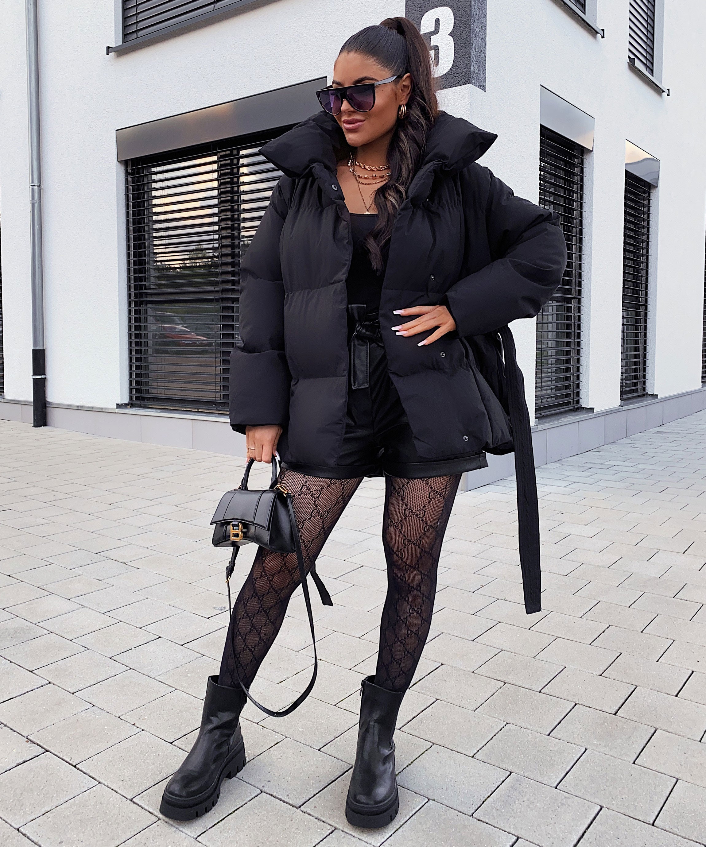 This black puffer jacket features a voluminous silhouette with a self-tie belt at the waist for adjustable shaping. The design includes a high padded collar, long sleeves, and horizontal quilting for even insulation. Two side pockets offer practical storage, and the concealed fastening maintains a clean front finish. The jacket’s lightweight padding provides warmth and comfort during cold weather while supporting easy layering over everyday outfits.