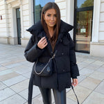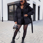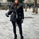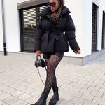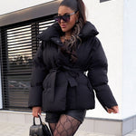 Black Belted Puffer Jacket with High Collar and Side Pockets